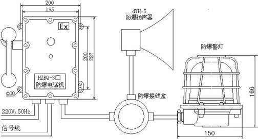 該系統為無主機防爆擴音對講系統,該系統也可做調度指令電話。系統內的防爆話站由防爆擴音對講直通電話機和防爆揚聲器(防爆喇叭)等組成,主叫摘機即可啟動其它話站的揚聲器進行擴音呼叫。兩臺以上直通電話機相連,即可構成防爆擴音通訊系統。該系統不需要傳統的主機,所有的功能均由防爆擴音對講直通電話機完成。該系統取消了傳統的防爆擴音轉接器,把防爆擴音轉接器的功能集中到防爆電話機內,使其結構更加簡單,安裝和維護更加方便。話機采用兩芯信號總線傳輸,交流電源供電,話機采用先進的編碼解碼技術和邏輯控制電路,各種信號不需轉接直達所有話機,啟動速度快且操作極為簡單。該系統可用抗噪聲手柄(又稱防爆抗噪聲電話機),使系統在高噪聲環境中呼叫通話更加清晰。