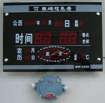 該防爆數(shù)字鐘(數(shù)碼信息萬(wàn)年歷)采用先進(jìn)的集成電路制成的防爆本質(zhì)安全型數(shù)字萬(wàn)年歷,供電經(jīng)BKZ-1型防爆轉(zhuǎn)接器接入220V交流電源。該防爆數(shù)字鐘為壁掛式,適用于含有易燃易爆氣體混合物的場(chǎng)所,如石油、化工、油庫(kù)、鋼鐵、焦化、礦山等企業(yè)。