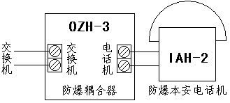 OZH—3型防爆本安電話機(jī)耦合器接在電話交換機(jī)(或其它調(diào)度電話交換機(jī))和防爆本安電話機(jī)之間,是本安型防爆電話機(jī)的關(guān)聯(lián)設(shè)備。該耦合器可以同所有類型的本安型防爆電話機(jī)配套使用。
