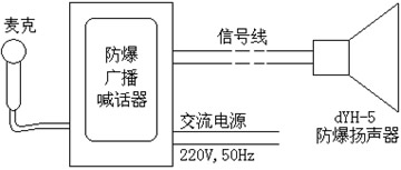 GJ-2型防爆廣播喊話系統(tǒng)又稱防爆廣播擴(kuò)音機(jī)或防爆擴(kuò)音喊話器,由HZBQ-3B型防爆廣播喊話器(防爆電話機(jī))、麥克風(fēng)(或手持話筒)和dYH—5型防爆揚(yáng)聲器組成。打開麥克風(fēng)上的開關(guān),對(duì)著麥克風(fēng)(話筒)講話,可以通過(guò)揚(yáng)聲器對(duì)現(xiàn)場(chǎng)進(jìn)行廣播呼叫,發(fā)布生產(chǎn)指令或報(bào)警。該系統(tǒng)也可加入防爆警燈,構(gòu)成聲和光同時(shí)提示信號(hào)。