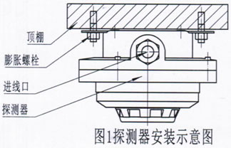 根據(jù)現(xiàn)場情況用M6膨脹螺釘通過探測器固定爪,將防爆外殼固定在頂棚上。電纜的引入裝置采用封壓膠圈結構,電纜外徑為8mm,電纜的防爆進線口為M22×1.5內螺紋。探測器安裝示意圖如圖1所示。